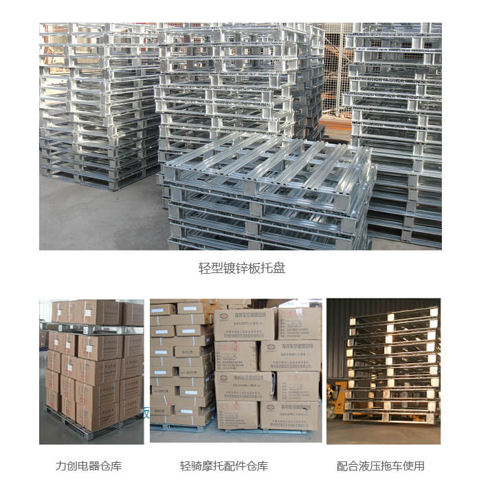 轻型B型镀锌托盘 产品用途: 本产品采用上海宝钢大锌花0.5—1.0mm厚的镀锌板轧压变形,优点质量轻承重好,焊点处涂银粉油漆或植物桐油防止焊点生锈。应本产品热镀锌层面工艺,防锈能力非常强,广泛用于轻工业制造,如冷链、食品车间生产、酒水制造,电子制造仓储与周转。对比木板托盘免熏蒸,常作为随货底托,随产品一次性出口。提示:不建议上货架,如上货架,主材厚度1.2mm。