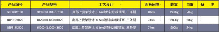 产品名称:轻型B型镀锌托盘 产品编号:QTPB1210120 产品规格:W1200×L1000×H120 托盘主孔:100mm 托盘侧孔:80 mm 产品自重:20kg 产品静载:800kg 产品动载:600kg 上货架载:300kg 产品配置:采用宝钢镀锌板轧机成0.6*10*85多筋骨面板 10根,以间隔84mm 和6根板做腿+12个立撑 组成。 产品用途:广泛用于酒水、食品、化工、电子等大量物品 仓储与周转。本结构为上货架设计。