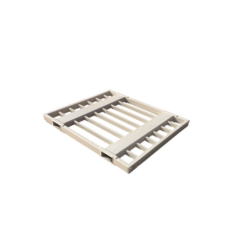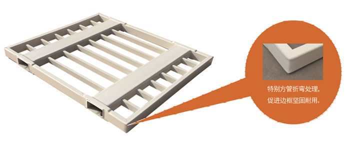BA型小圆角双凹面钢托盘 产品用途:主要为袋装的软包装大批量物品存储和周转。改变老式四个尖角焊接,采用圆角工艺,主要防止麻袋在放置时不容易刮破。