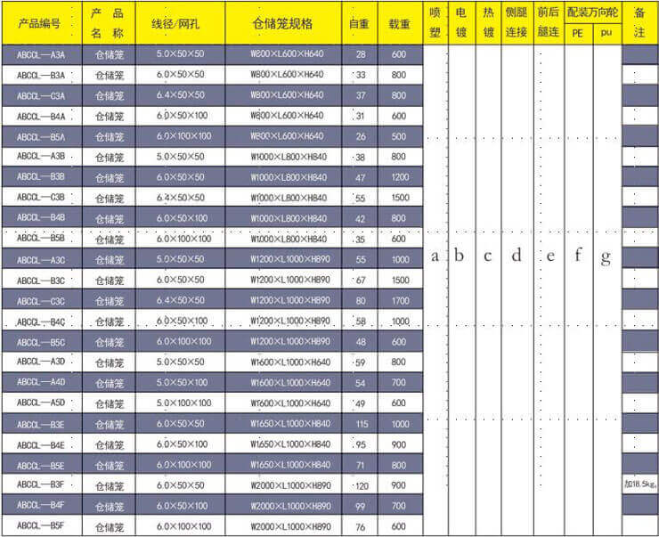 A1A(为网孔25*25mm),2(为网孔25*50mm),3(为网孔50*50mm)4(为网孔50*100mm) 5(为网孔100*100mm)。A1A代表笼子规格L800*W600*H640,B代表表笼子规格L1000*W800*H840,C代表表笼子规格L1200*W1000*H890